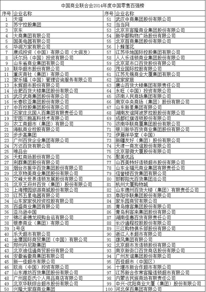 【優酷亞克力制品】:中國零售百強公布:天貓居首 蘇寧第2